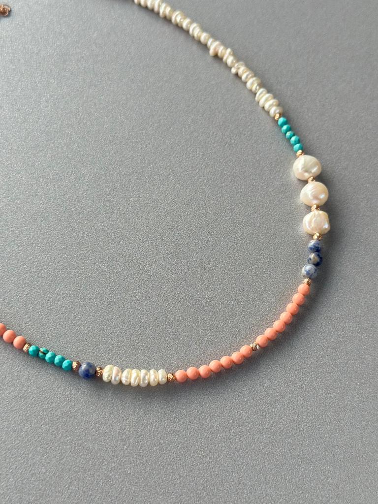 *İnci, Pembe Mercan, Sodalit ve Havlit (mavi) taşı kullanılmıştır. Rose Altın kaplama yapılmıştır.